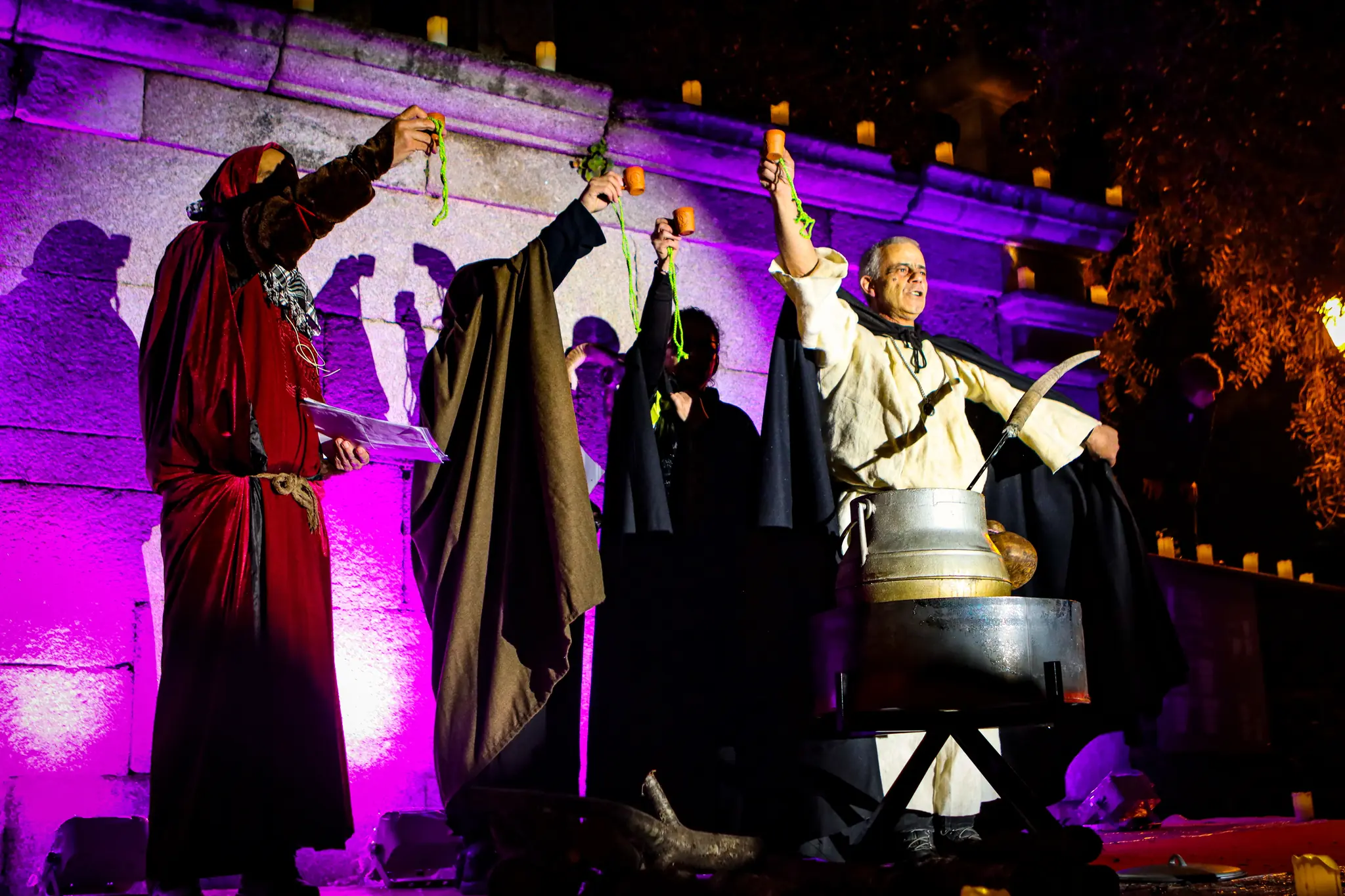 Numa invocação à ancestralidade pagã do ritual, chegados às onze da noite, em pleno breu interrompido, apenas, pela iluminação de tonalidade roxa em apelo à paixão de Cristo, inicia a queimada galega, feita de aguardente e açúcar num velho pote de ferro.